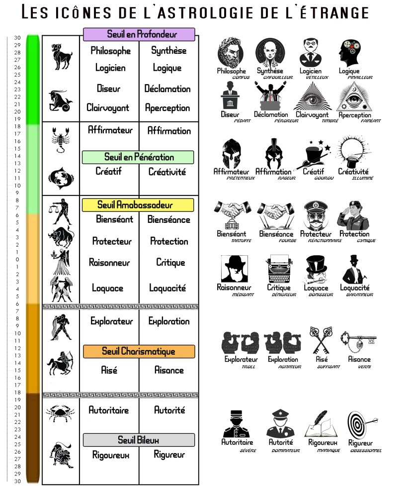 Capricorne : C’est le segment le plus surnaturel de tous les signes. Il concerne deux types de facultés d’ordre ésotérique. Le premier concerne l’aperception, la clairaudience, la clairvoyance, représenté par l’être psychologique. La deuxième faculté concerne le don de diseur. C’est-à-dire un orateur influent ou charismatique. Ce dernier est représenté parl’être lexical. l’oracle dit que l’être psychologique est un clairvoyant engagé dans l’aperception. L’être lexical est un diseur engagé en tant que disant. dans les bas moment, l’oracle irrévérencieux parle de l’être psychologique étant est un timbré, fainéant. Tandis que l’être lexical est un pédant péroreur. D’un point de vu quantique, CAPRICORNE est selon l’oracle dédié à des facultés exceptionnelles. La première concerne une foudre d’éloquence en tant que diseur. Il est généralement hautement susceptible de séduction, jusqu’à même vous mettre en capacité de vous connecter avec des hologrammes. Ce dernier se range du coté de l’hémisphère gauche. La deuxième faculté concerne un simple récepteur, ou autrement dit une faculté extrasensorielle, son pouvoir est de capter, les ondes oscillatoires. Ensuite, ce troisième œil ésotérique ou œil synoptique à la capacité d’interpréter une expression audible à l’intérieur des tubulaires de l’hémisphère droit… pour y être distillé dans les circuits imprimés de l’hémisphère droit, afin d’élaborer un discours écrit/parlé cohérent.