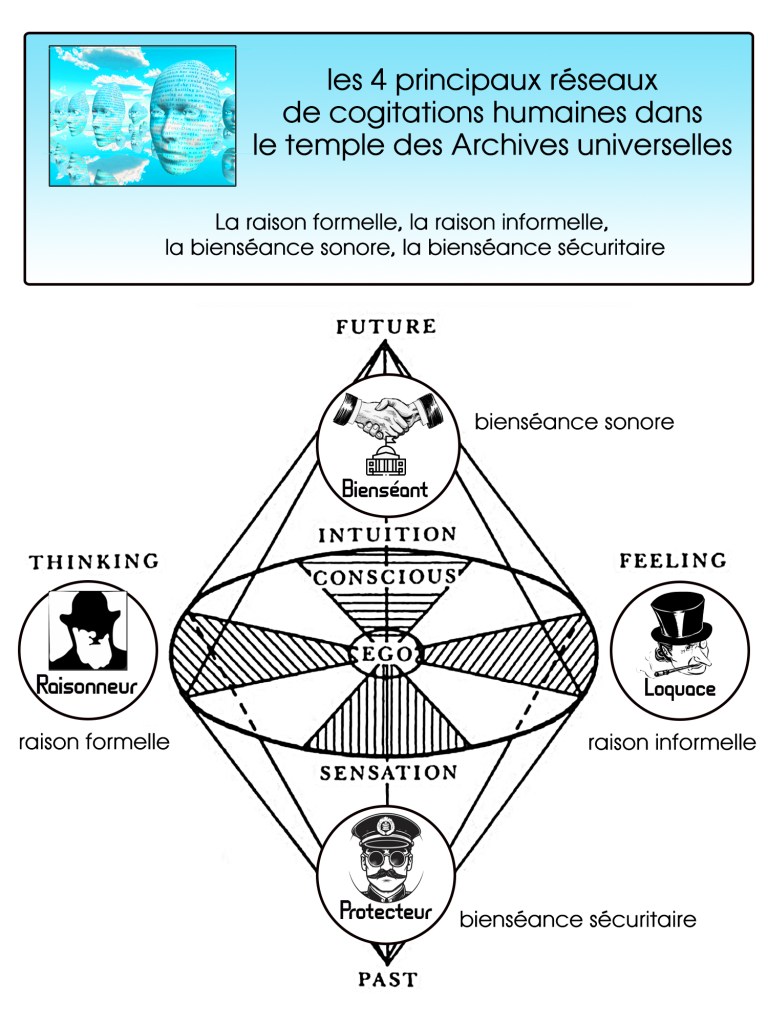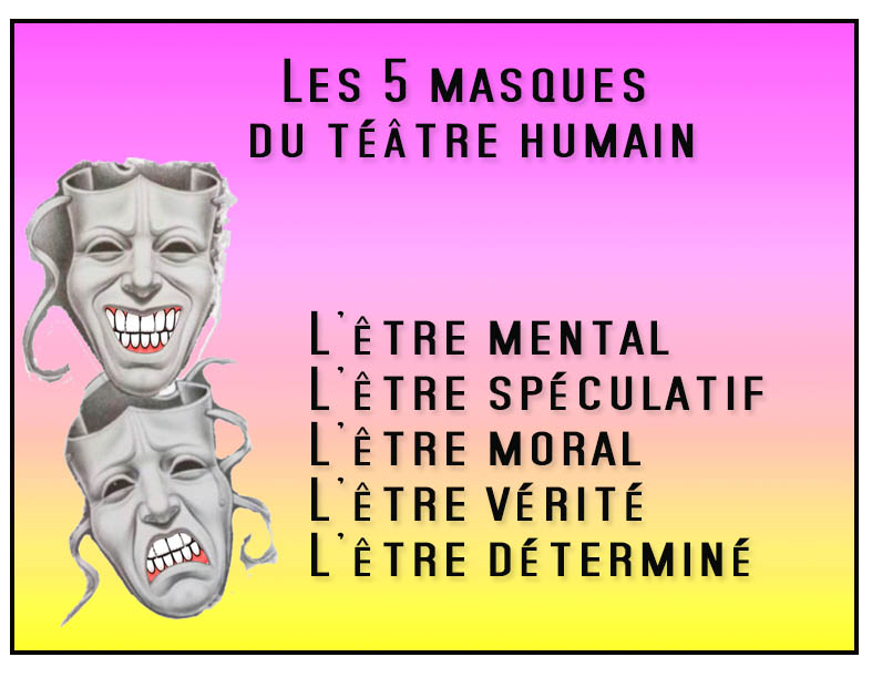 Mais avant de commencer cette liste d’interprétations aux reflets secrets du monde quantique. J’aimerais ouvrir avec vous, le tout premier organigramme qui compose les 5 principaux masques, que j’apparente à 5 principes utiles à des interprétations ésotériques.
