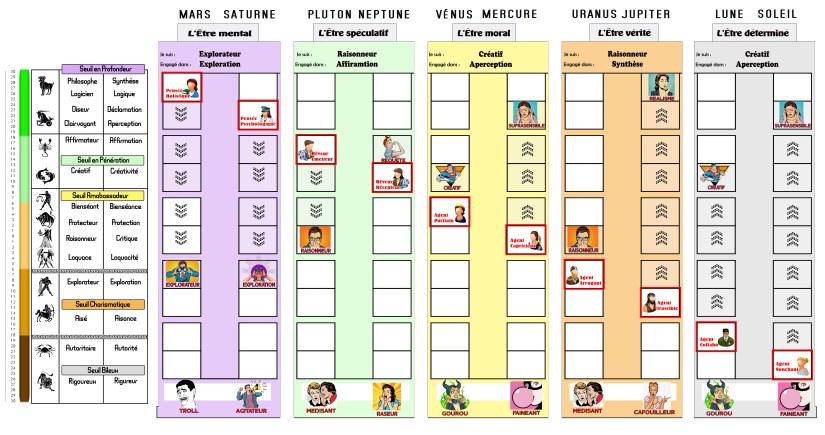 L’être moral Se situe dans la zone limbique. Ce segment gère les émotions et la mémoire et donc la profondeur de l’être. La lecture de son thème nous donne une indication de la profondeur de l’être ainsi que ses valeures morale.